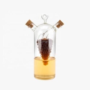 Bouteille huile et vinaigre en verre avec bec verseur et bouchons en liège. Design décoratif en forme de raisin, idéale pour cuisine et table au Maroc.