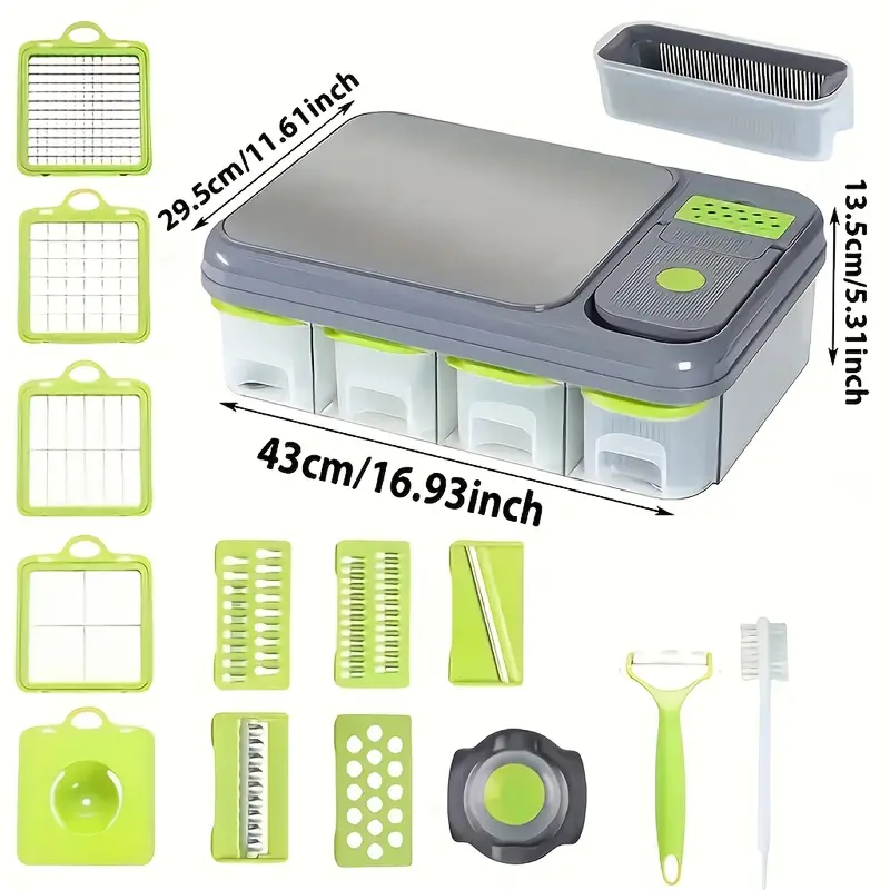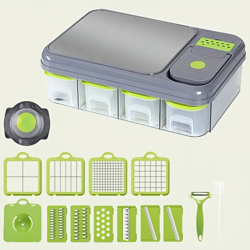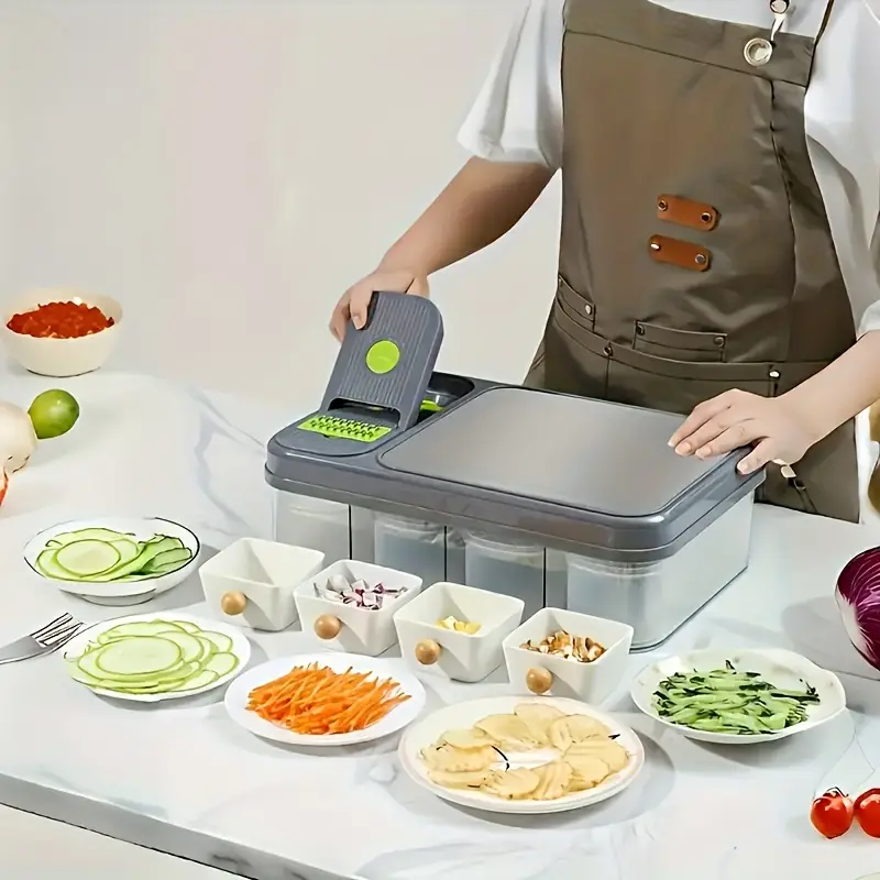 Transformez votre façon de cuisiner avec ce coupe légumes multifonction 12 en 1, l’accessoire indispensable pour toutes les cuisines marocaines modernes. Conçu pour vous faire gagner un maximum de temps, d’espace et d’efficacité, ce kit tout-en-un vous permet de râper, trancher, émincer, découper et organiser vos ingrédients en toute simplicité.
