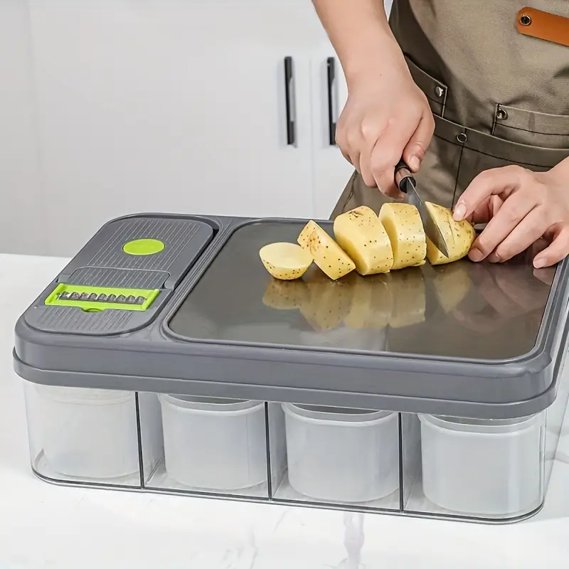 Les tiroirs de rangement transparents intégrés permettent de garder vos découpes bien organisées, sans salir votre plan de travail. Le couvercle plat sert de planche à découper solide, idéale pour hacher les aliments.
