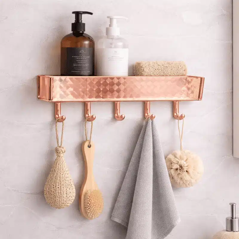 Cette étagère murale salle de bain avec crochets est idéale pour les foyers au Maroc qui veulent un rangement fonctionnel sans sacrifier le style. Elle convient aussi bien à une salle de bain familiale, une salle d’eau d’invités, qu’à un petit appartement où chaque centimètre compte.