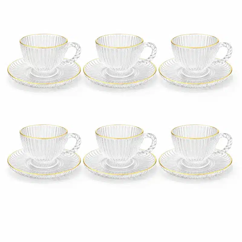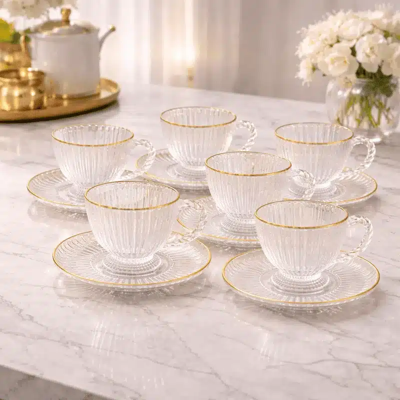 Apportez une touche d’élégance à vos moments de thé avec ce Lot de 6 tasses et soustasses service à thé en verre transparent orné d’un liseré doré. Conçu pour sublimer la table marocaine moderne comme les réceptions traditionnelles, ce lot de 6 tasses avec soucoupes assorties allie raffinement, transparence et finitions premium. Parfait pour le thé, les infusions ou le café léger, il met en valeur la couleur de vos boissons tout en ajoutant une note luxueuse à votre vaisselle.