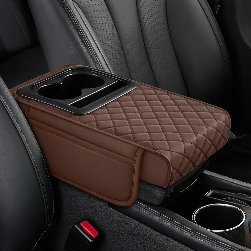 Ajoutez style, confort et organisation à votre intérieur avec cet organisateur de voiture en cuir matelassé. Conçu pour se fixer sur l’accoudoir central, il offre un double porte gobelets, un support pour téléphone, un espace pour mouchoirs et une poche latérale pour vos petits accessoires.