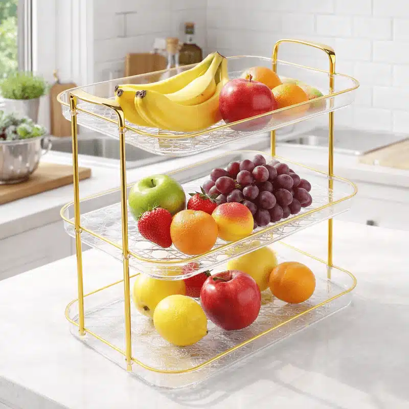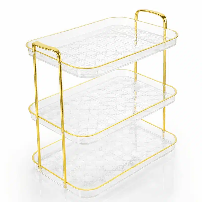 Mets en valeur tes desserts, fruits ou produits de beauté avec ce plateau de service 3 niveaux doré et transparent, à la fois chic et ultra pratique. Son design minimaliste avec structure dorée et plateaux transparents apporte une touche de luxe à ta cuisine, ton salon ou ta salle de bain, tout en offrant un vrai gain de place.