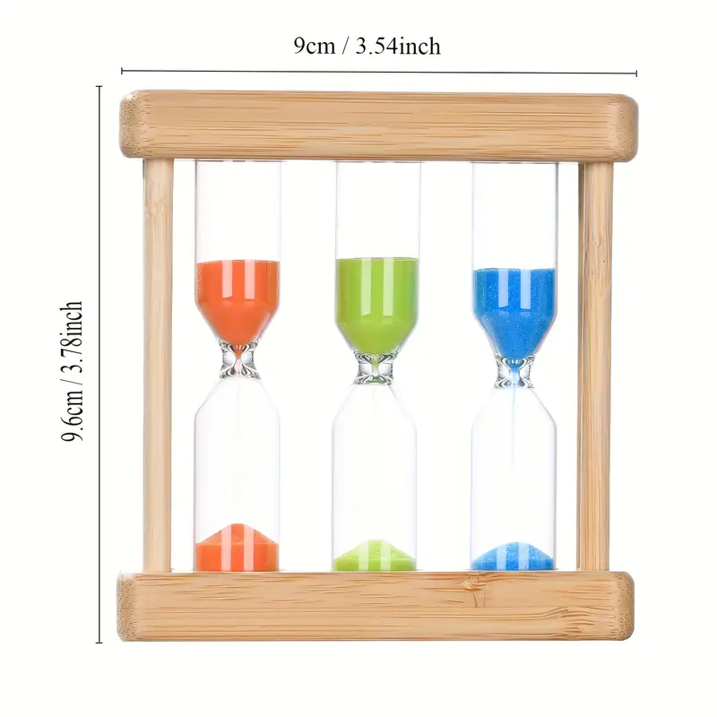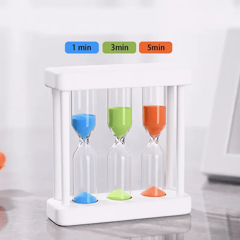 Ce sablier 3 en 1 est idéal pour toute la famille. Il contient trois sabliers intégrés avec des durées différentes (1 minute, 3 minutes, 5 minutes), identifiables par leur sable coloré (bleu, vert, orange).