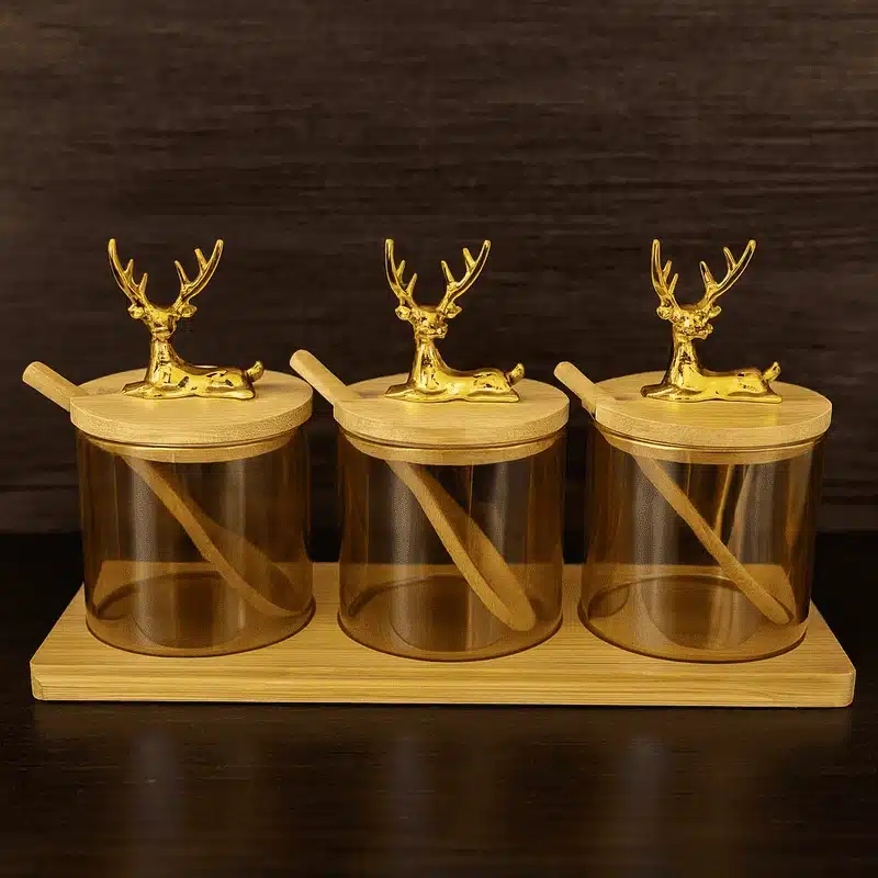 Le couvercle en bambou naturel est surmonté d’une figurine dorée en forme de cerf, symbole d’élégance et de raffinement.