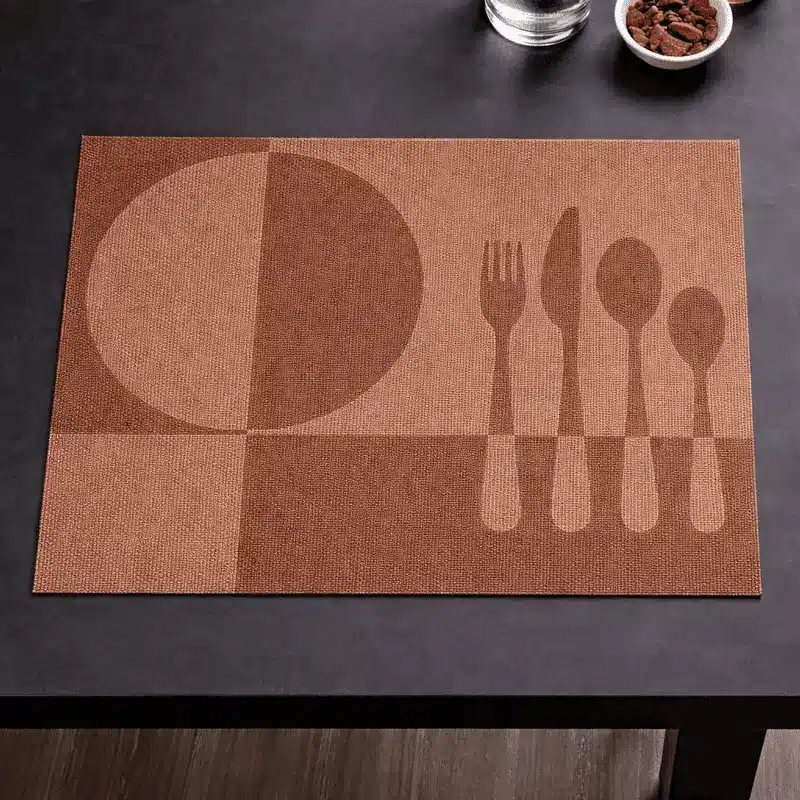 Son motif graphique représentant une assiette et des couverts donne un look moderne et aide à bien positionner le couvert, idéal pour une table toujours bien dressée. Disponible en plusieurs couleurs élégantes (doré, gris, marron…), ce set de table en PVC antidérapant s’intègre aussi bien dans une cuisine familiale qu’une salle à manger plus chic.